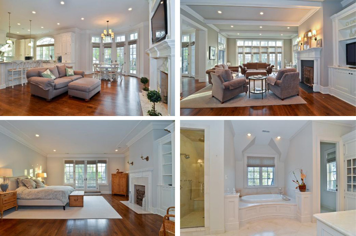 A graceful circular driveway arcs up to the front door that opens in to a grand—or maybe it's grandiose—double height foyer with inlaid marble floor and a curvaceous floating staircase. There are formal living and and dining room, the former with a fireplace and hardwood floors, plus a wood-paneled library and a family room, the latter with a fireplace. There's also a combination kitchen/den that features a fireplace surmounted by a flat screen t.v., a massive center work island with short snack bar, and a breakfast area in front of a curved wall of glass. (Oh, look, Here's the newlyweds having their picture taken in the kitchen with one of the people from People.)